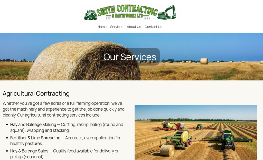 Smith Contracting is a family-run business focused on quality, safety, and efficiency — from hay and baleage to diggers and drainage. Trusted by councils and contractors alike